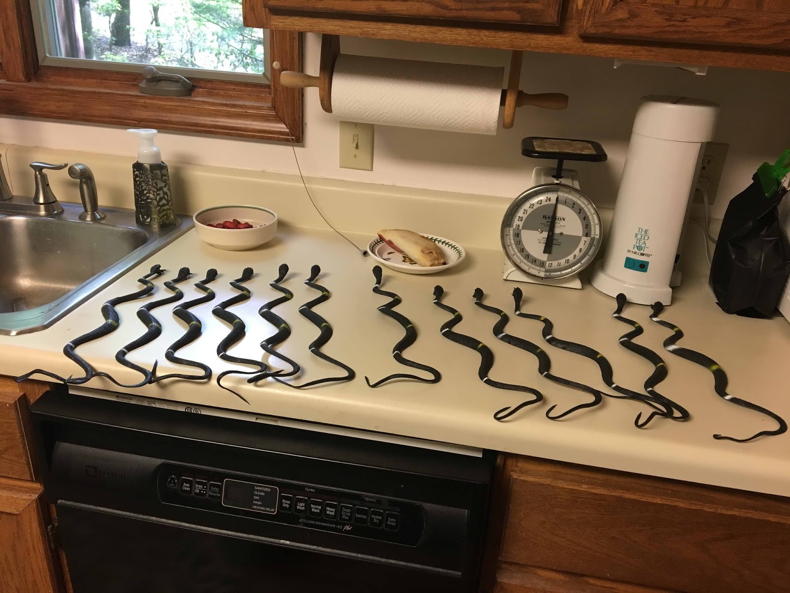 Snakes can make that stress come back, though. Luke discovered this one basking happily at our front door steps. IT was happy, we were not. Now, this big 5+ feet long black snake is MUCH better than any size copperhead or rattler. Still, we were not pleased when it decided to check out the actual porch and was heading for our front door. Scared it properly, but I have seen it prowling the back yard. That is fine - eat the mice, voles, and such, just don't ask to come inside!